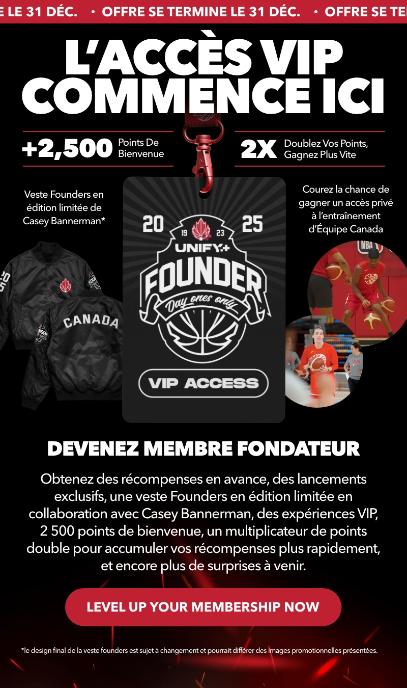 Les fondateurs bénéficient d'un accès anticipé à des récompenses, de cadeaux exclusifs, d'une veste Founders en édition limitée, d'expériences VIP comme l'accès à l'entraînement d'Équipe Canada, de 2 500 points de bienvenue et d'autres avantages à l'intérieur.